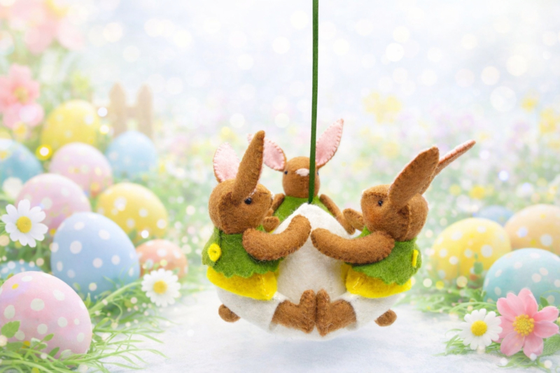 Drie allerliefste haasjes om een paasei, ze houden het ei goed vast en vallen niet naar beneden.